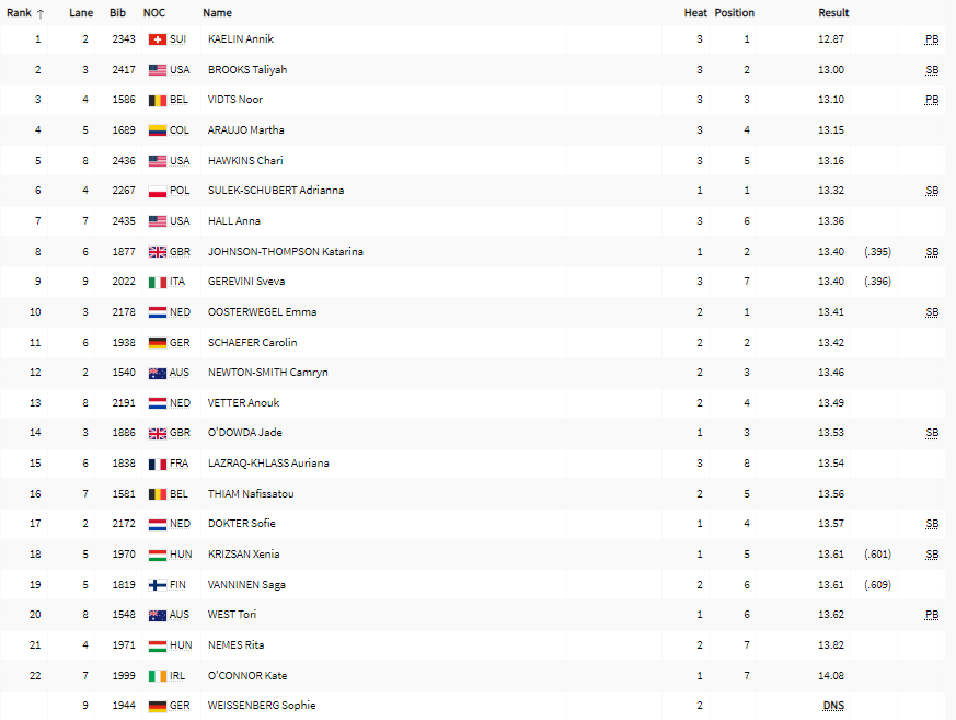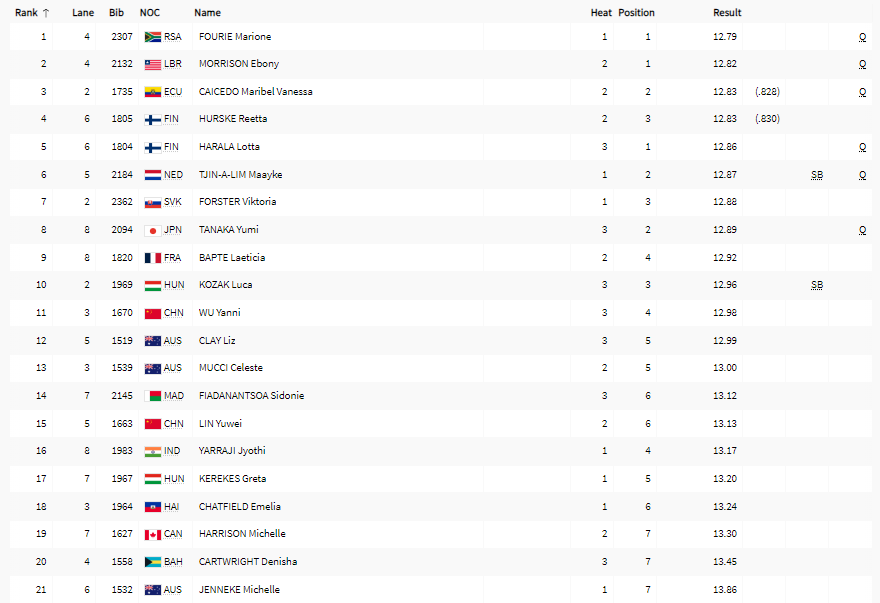 | 100 m hekk | H | QH | SF | F | ||||||||||||||||||||