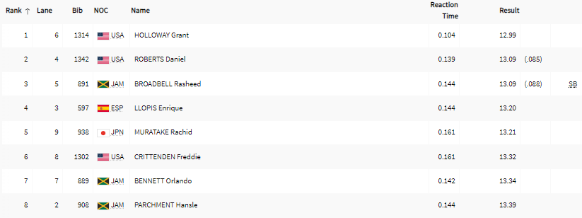 | 110 m hekk | H | QH | SF | F | ||||||||||||||||||||