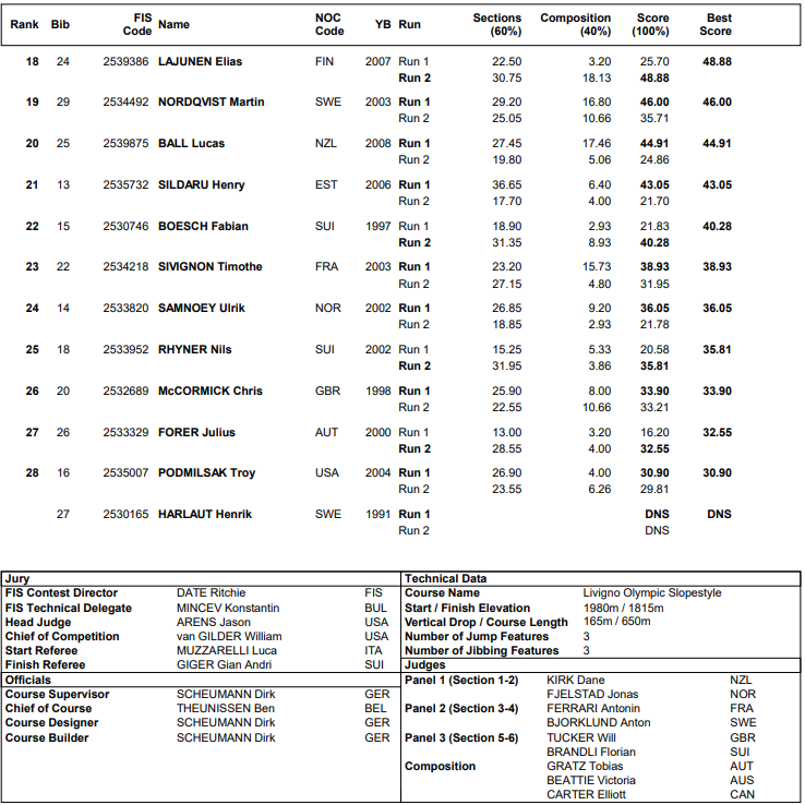 Program og resultater for alle Friski slopestyle menn under Vinter OL som arrangeres i Livigno i det nordlige Italia 10. februar 2026.
