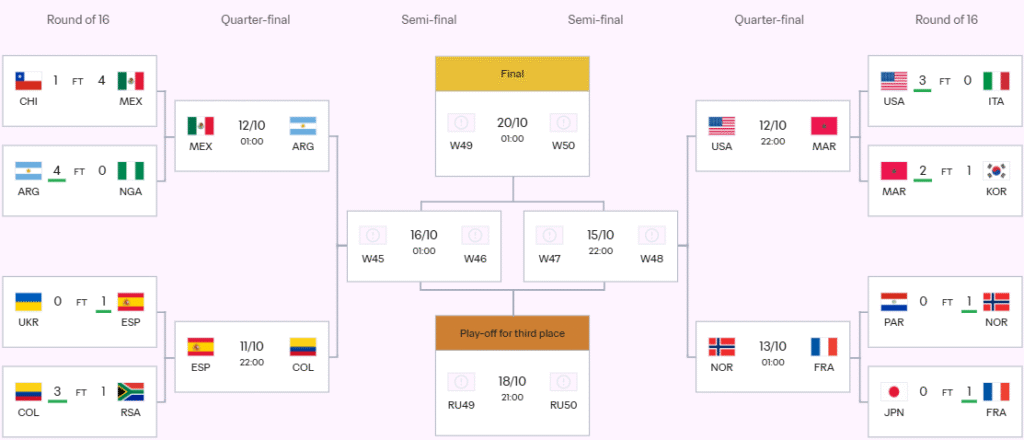 Åttendelsfinalene spilles fra 7. til 10. oktober, kvartfinalene fra 11. til 13. oktober og semifinalene 15. og 16. oktober. Mesterskapet avsluttes med bronsefinale 18. oktober og finale 20. oktober.