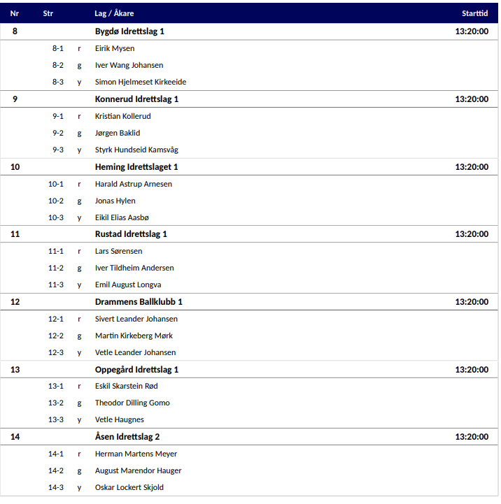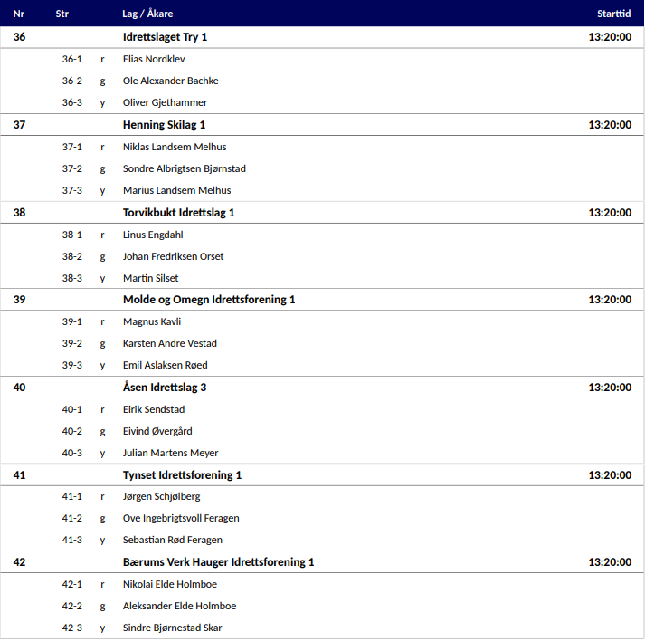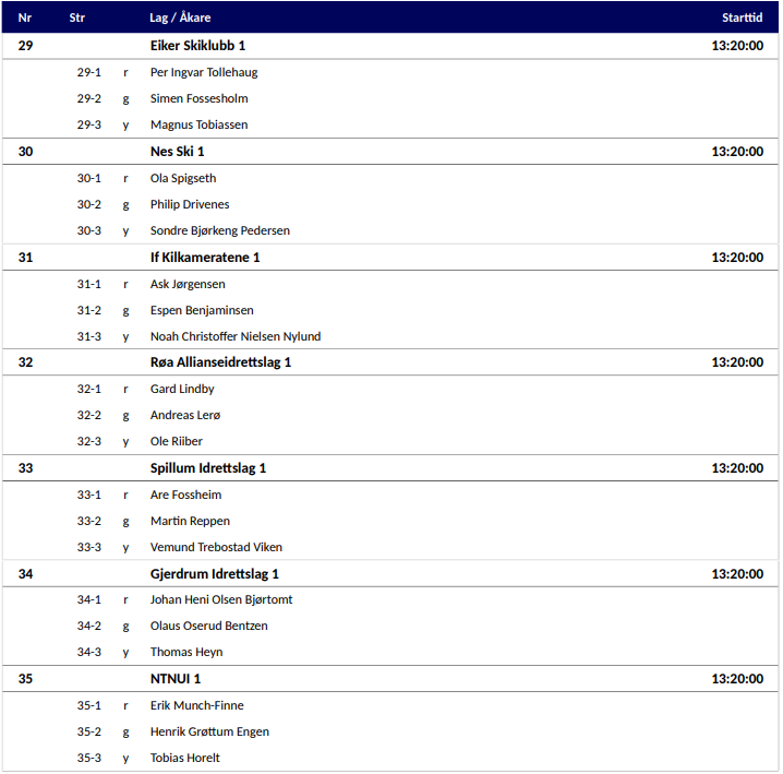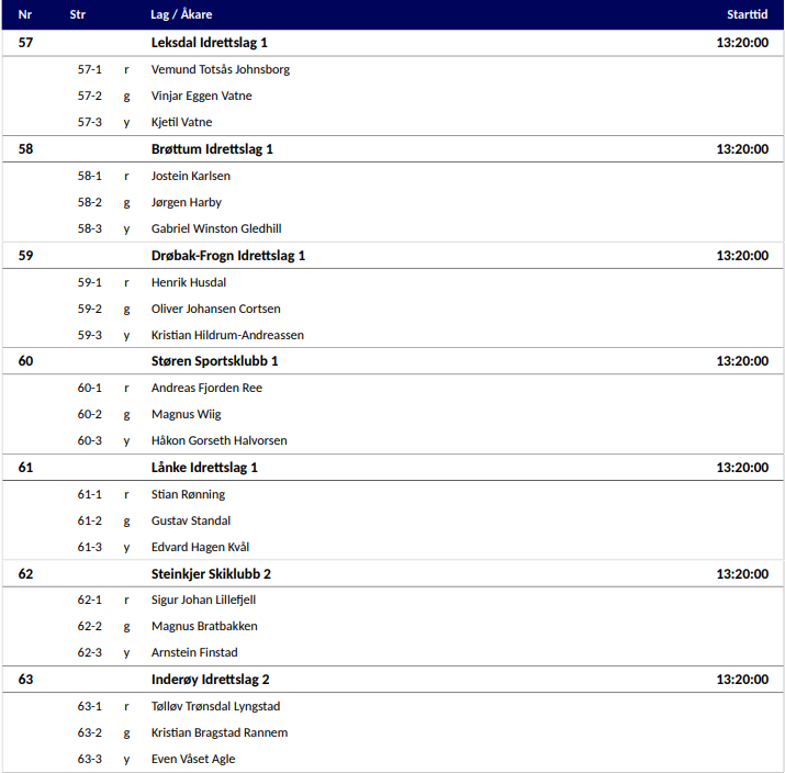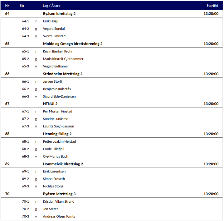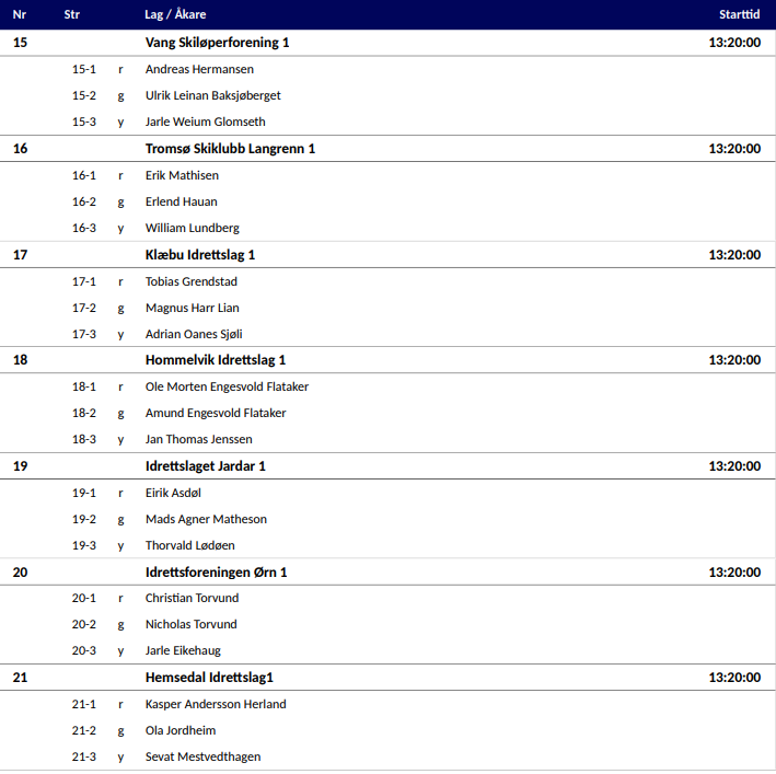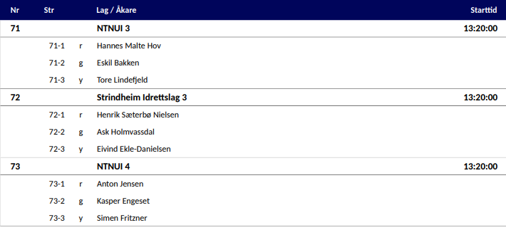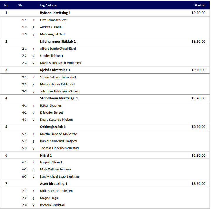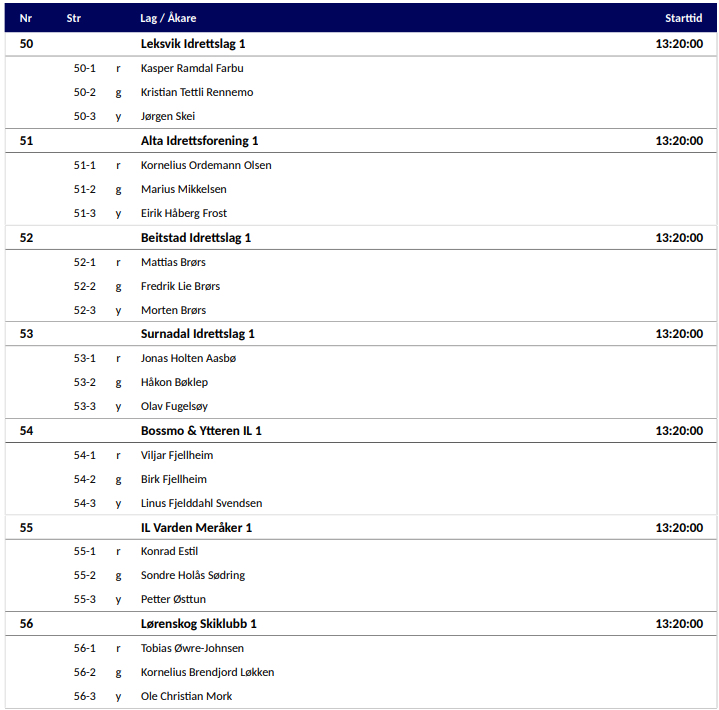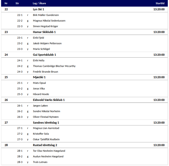 Startlistene offentliggjøres i forbindelse med lagledermøtet kvelden før respektive distanse.