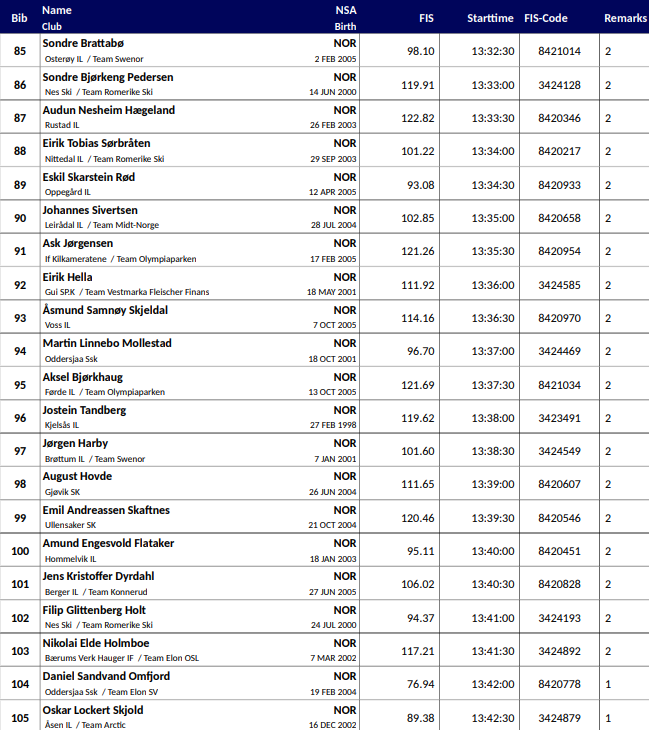 De 90/150 beste (K/M), påmeldte senior-løperne etter gjeldende FIS-liste,2distanse, får starte