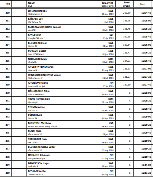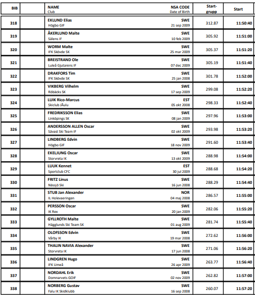 | 338 | Gustav Norberg | Falu IK Skidklubb | SWE | DNF |