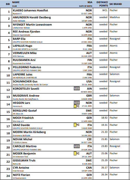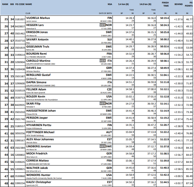 Startliste og resultater fra 20 km skiatlon menn under verdenscup langrenn Falun som arrangeres 1. mars 2026.