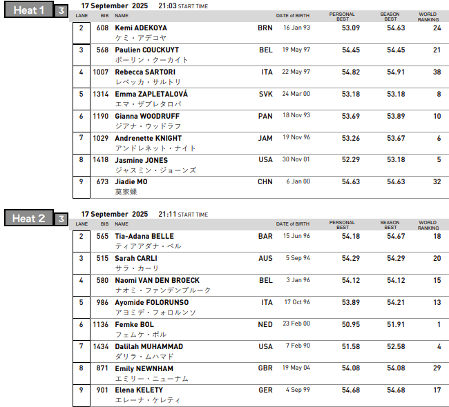 Startlister og resultater fra 400 meter hekk kvinner under VM Friidrett Tokyo som arrangeres 15. (forsøk), 17. (semifinale) og 19. (finale) september 2025.