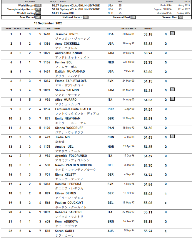 The third contender on the US team, Jasmine Jones (53.18), and Slovakia’s rising star Emma Zapletalova (53.18) are others who could challenge for the podium.