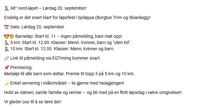 Startlister, program og resultater for 68 Grader Nord Løpet som arrangeres 25. oktober 2025.