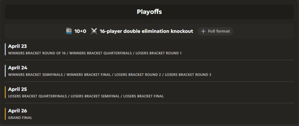- Grand Final Reset is 2 games + Armageddon tiebreaker