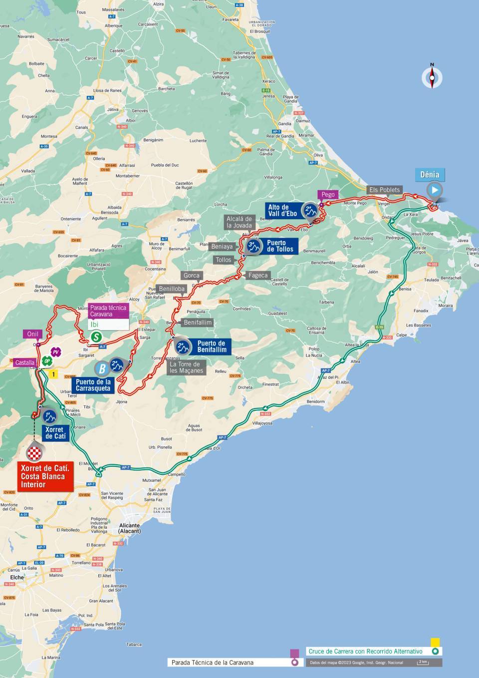 Resultater, tidskjema og kart for etappe 8 Vuelta a Espana fra Dénia til Xorret de Catí. Costa Blanca Interior lørdag 2. september 2023.