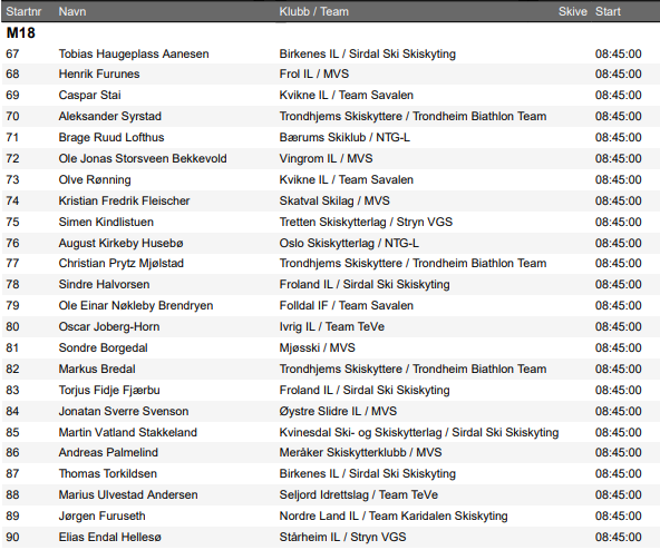 | 22 | Markus | Bredal | Trondhjems Skiskyttere / Trondheim Biathlon Team | 32:30.7 | 3:52.3 | 2+2+2+2 |