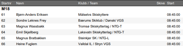 Startlister og resultater fra Fellesstart M18 under NC Finale skiskyting Stiklestad som arrangeres 29. mars 2025.