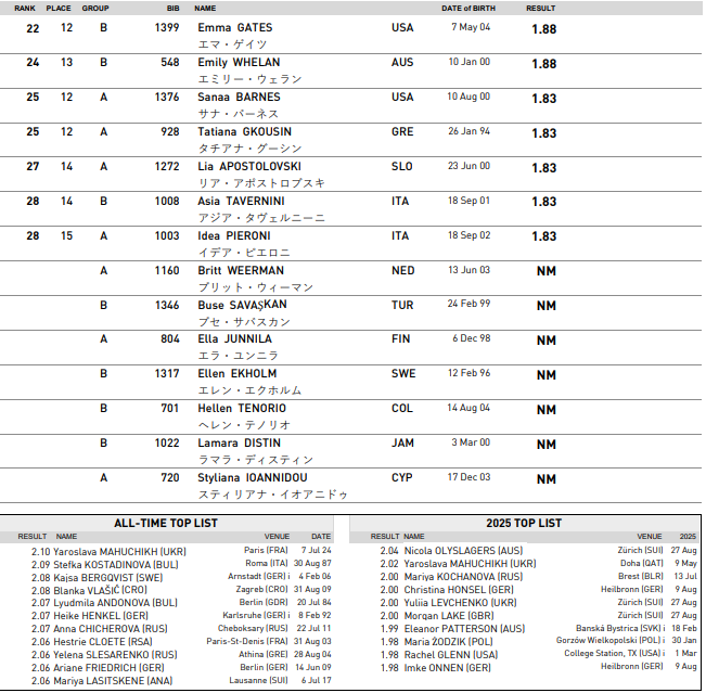 Mahuchikh, by contrast, has been unusually subdued this year, perhaps coming down from the high of her triumphant Olympic year. She finished third in Nanjing with a best clearance of 1.95, started the Diamond League season brightly with three consecutive wins, but has struggled to go above 2.00 consistently this season.