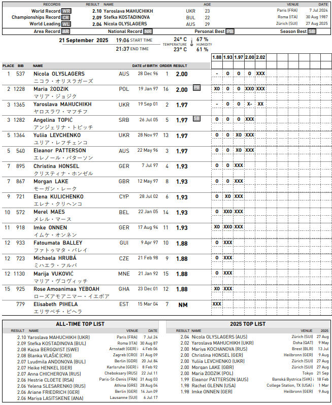 - Olyslagers has the world lead with 2.04m, set in the Wanda Diamond League Final