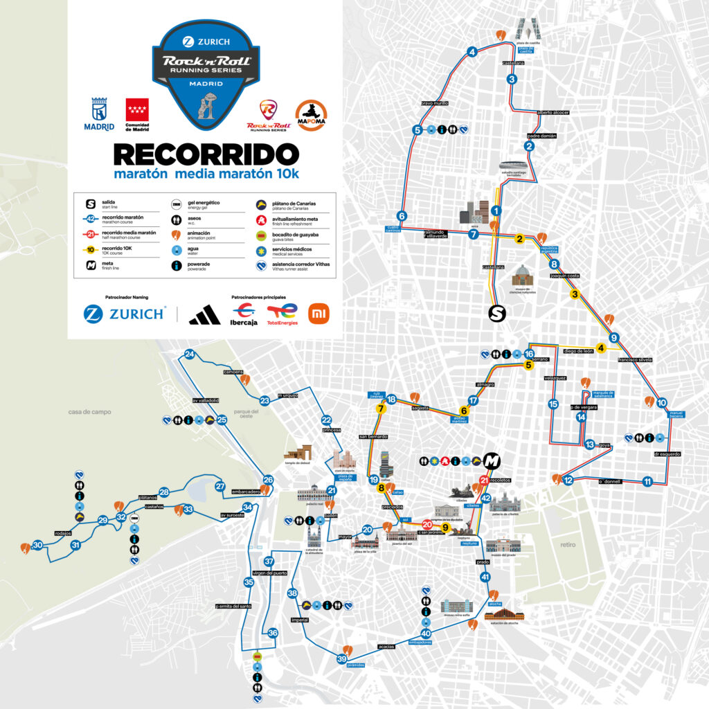The race course begins near Paseo de Recoletos and heads north past the Biblioteca Nacional de España, then the Santiago Bernabéu Stadium. After 8 kilometres the route turns southwards and heads back towards Nuevos Ministerios.