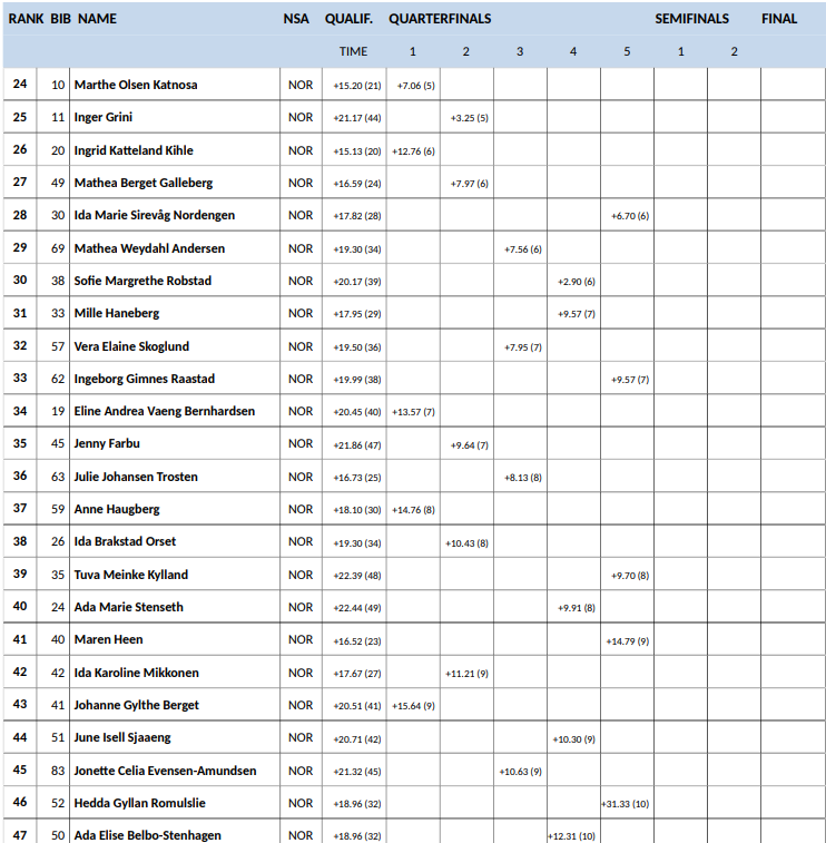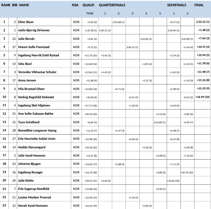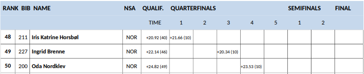 | 39 | 38 | Sofie Margrethe Robstad | Moelven IL / Team Kraftriket Hedmark-Sjusjøen | 2:55.75 | 20.17 |