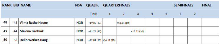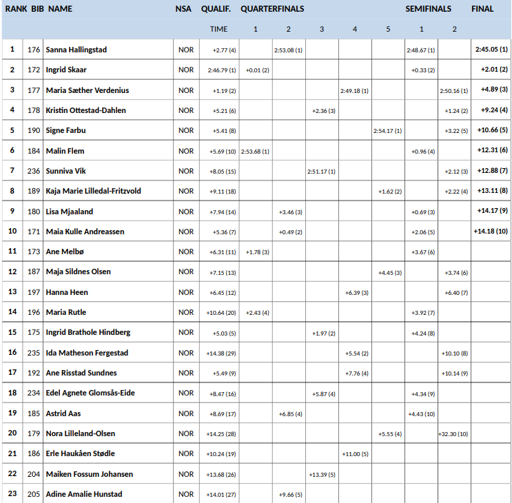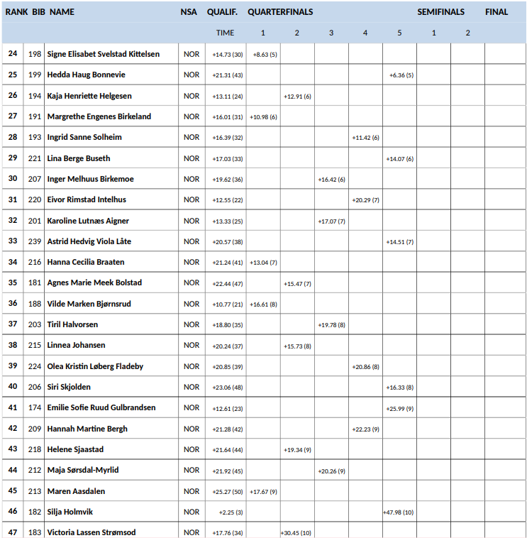 | 13 | 7 | Erle Sagerup-Nordkild | Kvaløysletta Skilag | 2:48.26 | 12.68 |