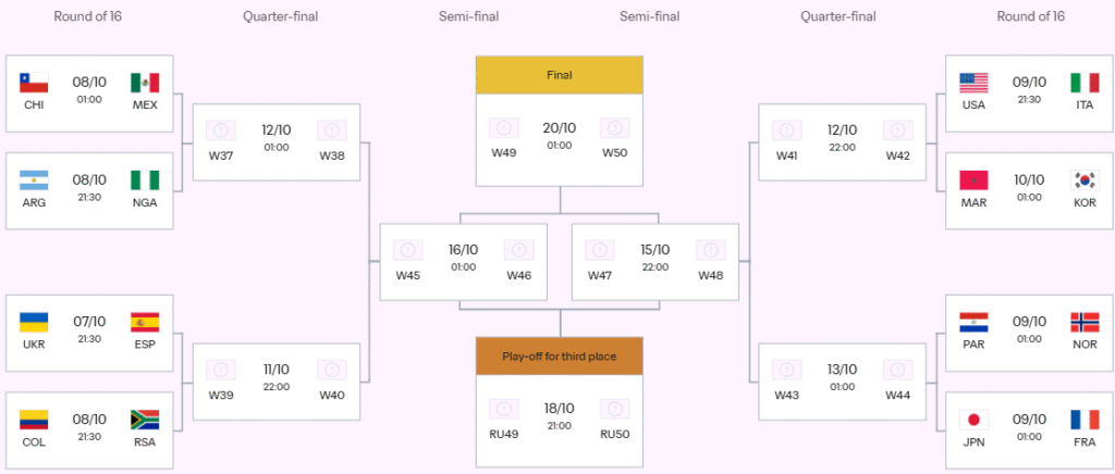 Åttendelsfinalene spilles fra 7. til 10. oktober, kvartfinalene fra 11. til 13. oktober og semifinalene 15. og 16. oktober. Mesterskapet avsluttes med bronsefinale 18. oktober og finale 20. oktober.
