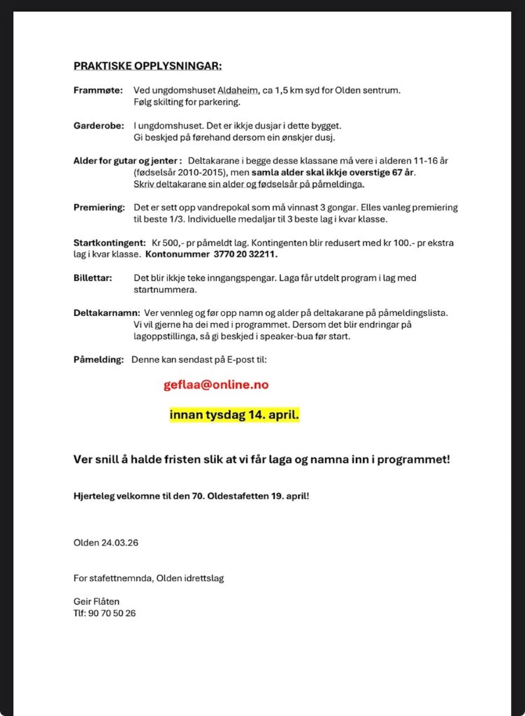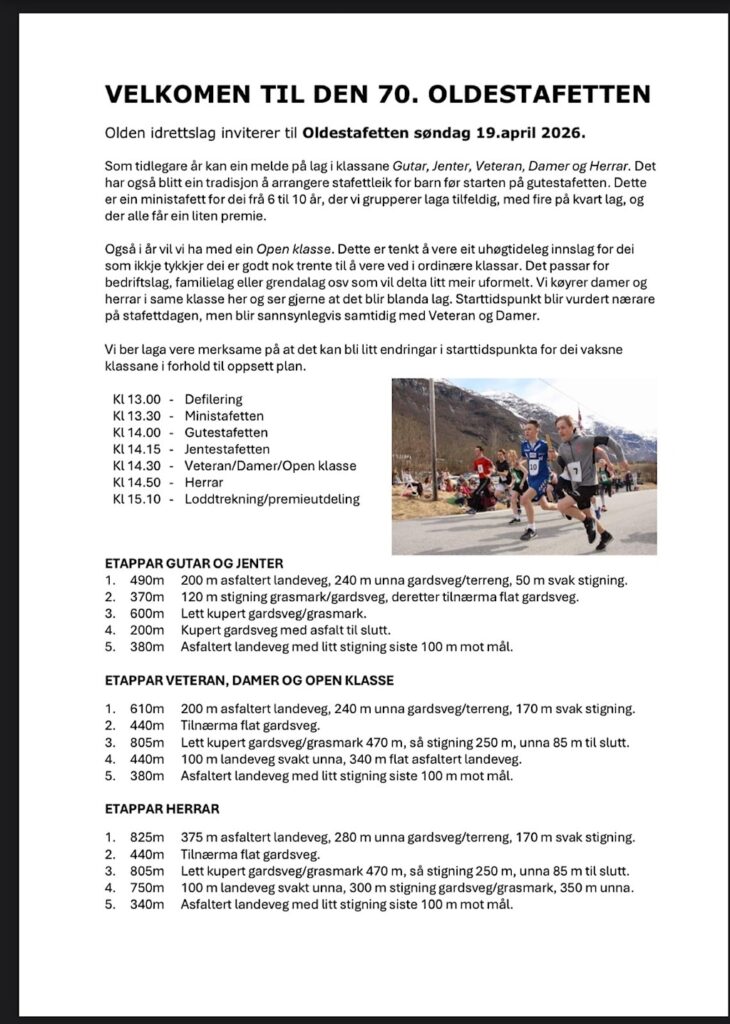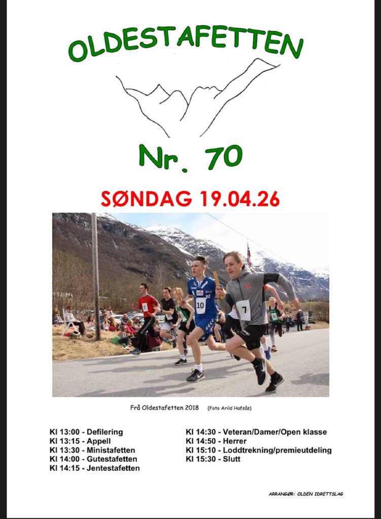 Startlister og resultater fra Oldestafetten som arrangeres søndag 19. april 2026.