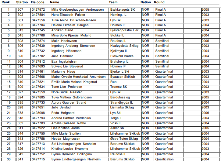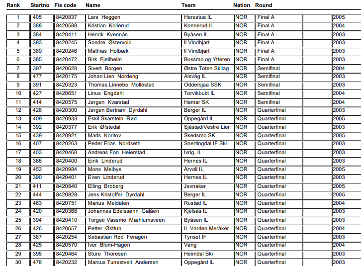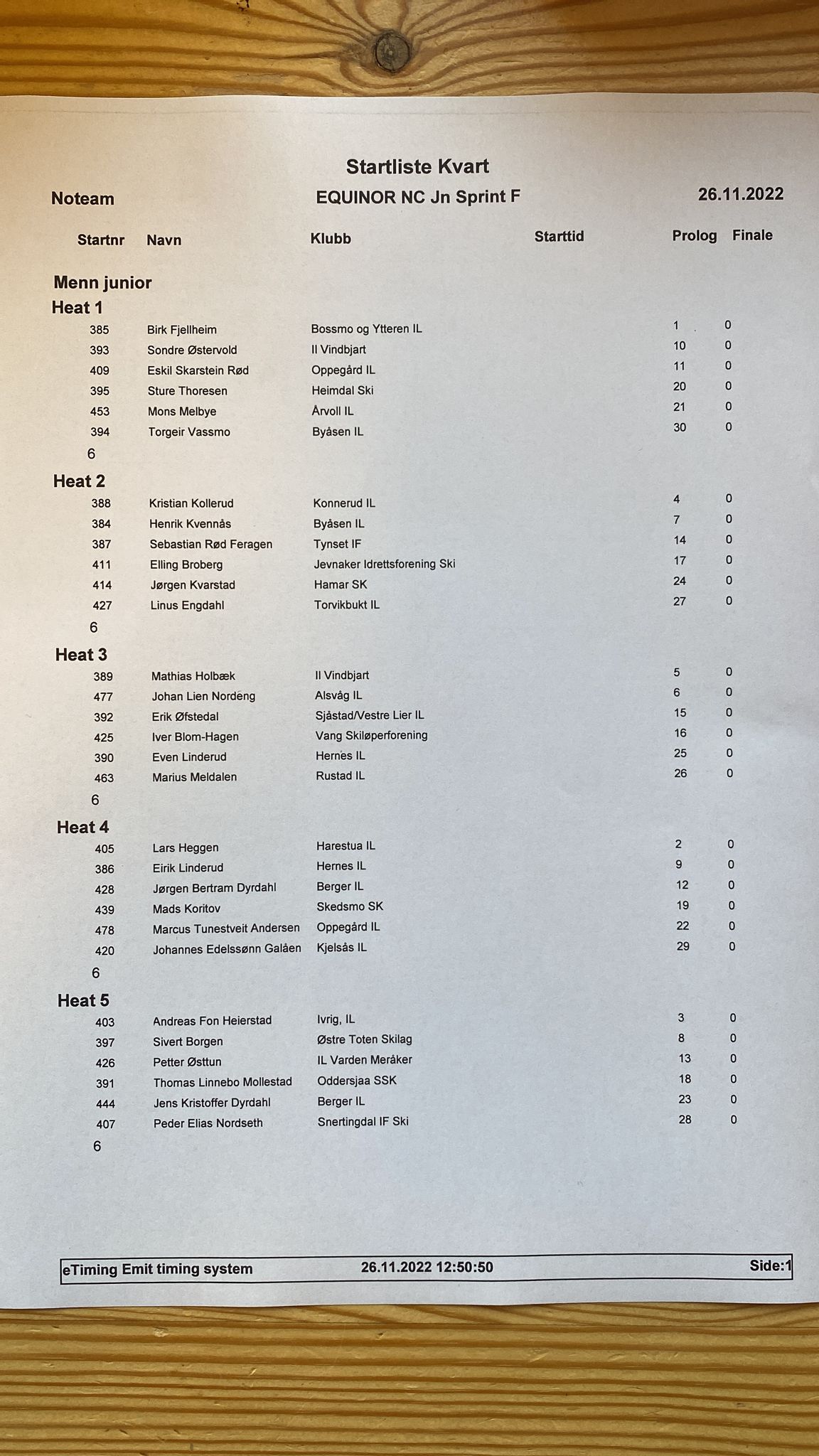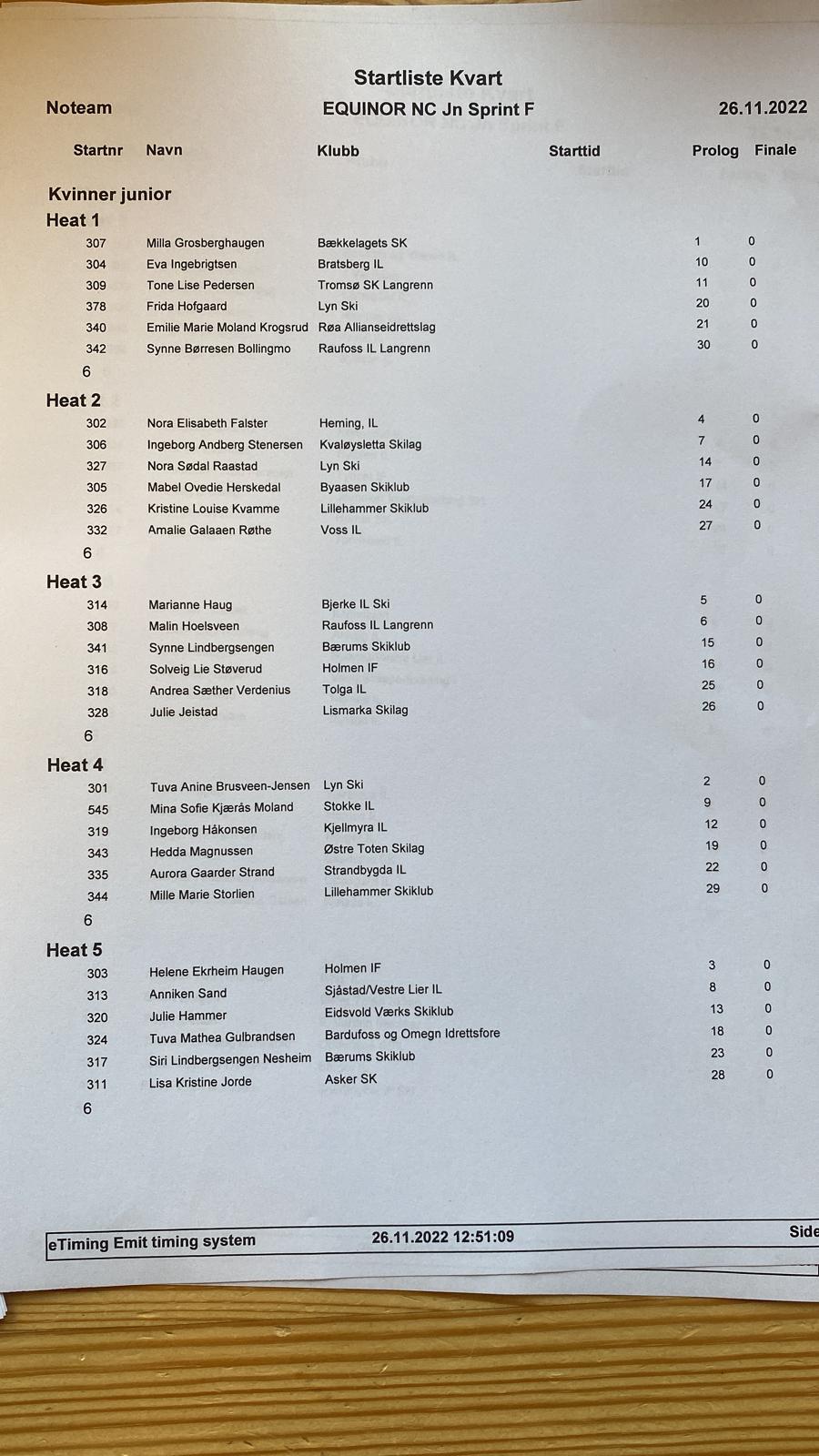 Resultater sprint fri teknikk junior Gålå lørdag 26. november 2022.