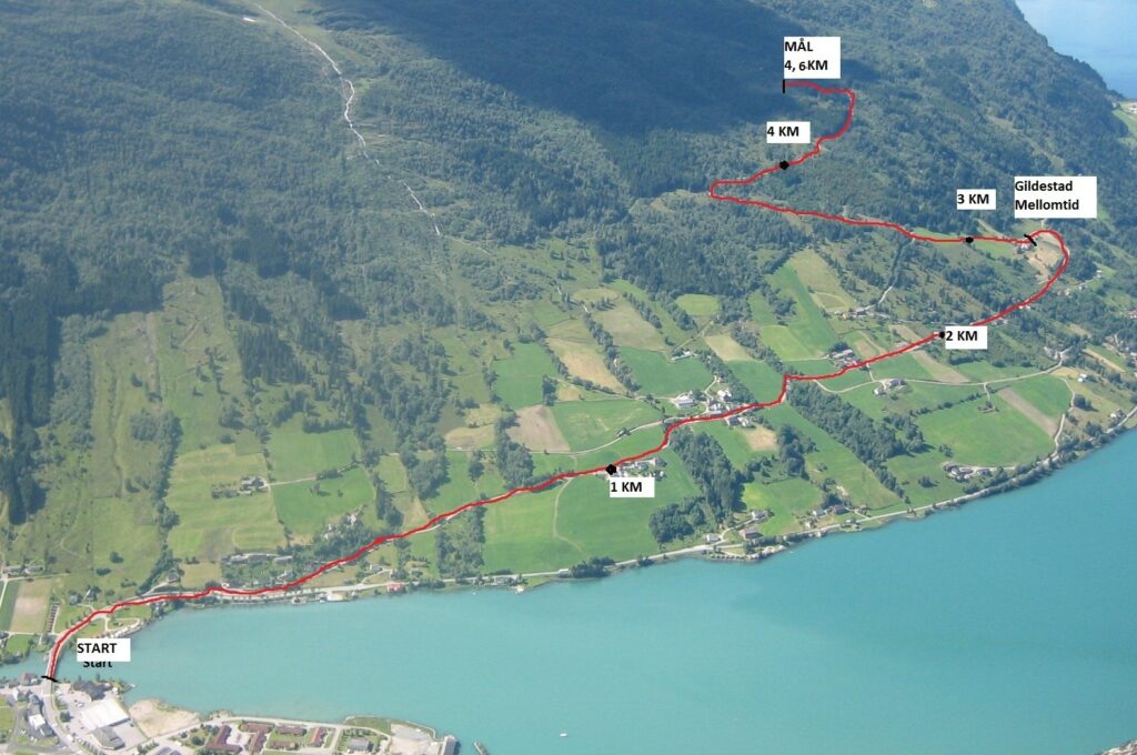 Løypa er 4,6km med ein høgdeskilnad på 400m. Starten er i Olden sentrum. Deretter går løypa omlag 2km på asfalt. Dei resterande 2,6km er på grusveg og skogsveg. Det er spurtpris i Skarsteinstunet etter 1,2km og mellomtid på Gildestad etter 2,8 km. Løypa er godt merka og kjent for sine mange og underhaldande sponsorskilt. Sponsorane kjøper motbakkar og navngir desse