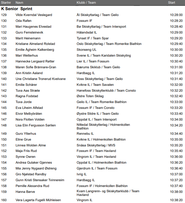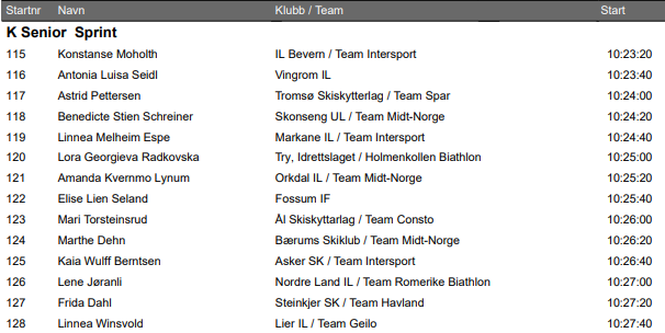 | 23 | Hanna | Børve | Kvam Langrenn- og Skiskyttarklubb / Team Havland | 26:28.1 | 3:33.4 | 1+2 |