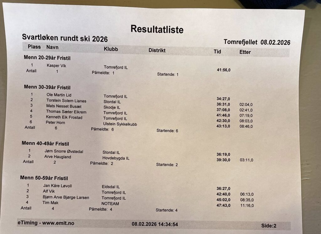 Startlister og resultater fra Svartløken Rundt som arrangeres 8. februar 2026.