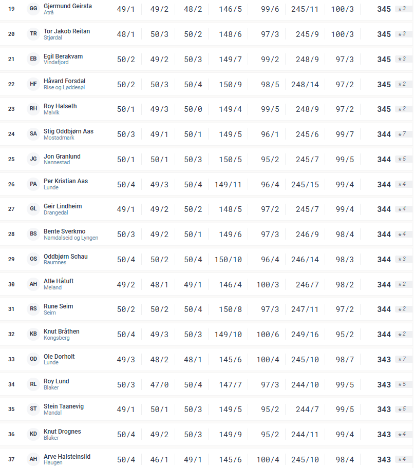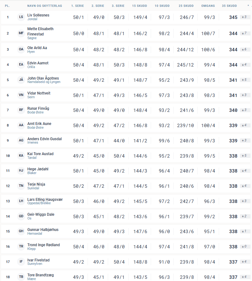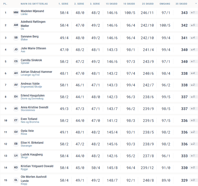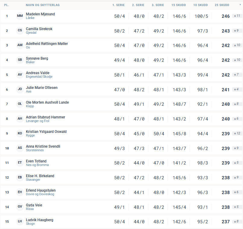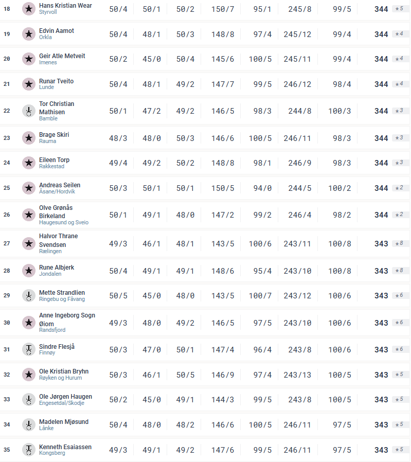 Topp 36 (de 15 beste er kvalifisert til Kongelaget)